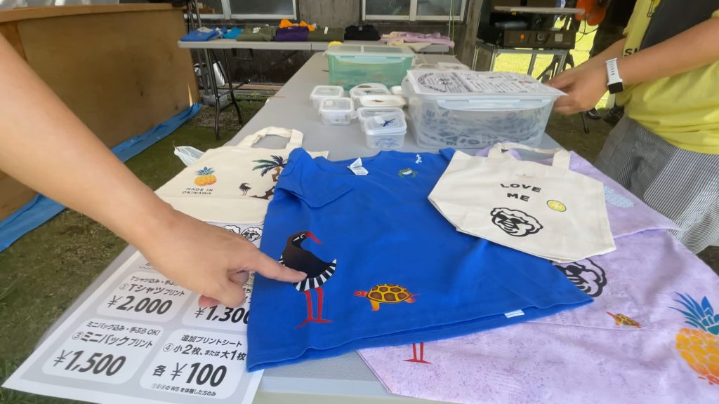 さらに、オリジナルのTシャツやバッグが作れるプリントワークショップも発見!パイナップルやヤンバルクイナなど、沖縄らしいモチーフを選んで自分だけのアイテムを作ることができます。プリントシートにはシークワーサーの絵柄も。手ぶらで来て楽しめる体験コーナーは、子供から大人まで大人気でした。