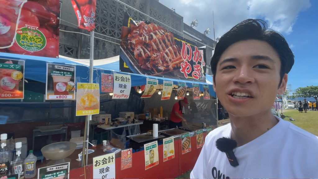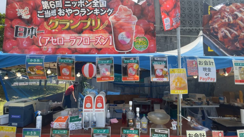 もちろん、お祭りには欠かせない美味しいグルメも盛りだくさん!アセロラフローズンや焼きそば、ハイボールなど、食欲をそそる屋台が軒を連ねます。残念ながら、ステージイベントを控えたあつきにいにいとひーとーは、お酒を飲むことはできませんでしたが、会場の熱気と美味しそうな香りに包まれ、夏まつりの雰囲気を満喫していました。