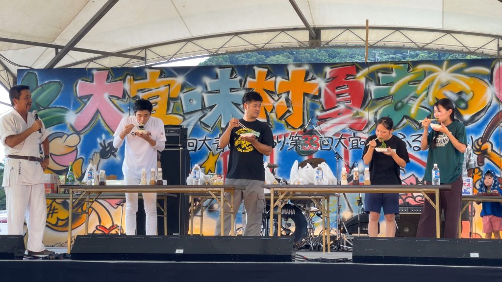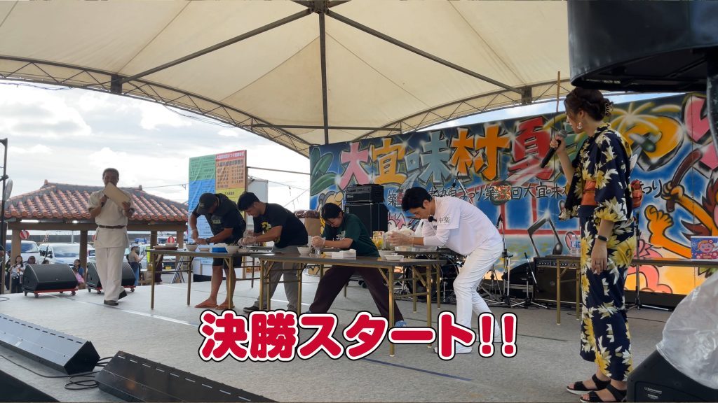 ステージイベントの後半では、大宜味村特産品を使った「まーさむん食べ飲み大会」が開催されました。「まーさむん」とは沖縄の方言で「美味しいもの」という意味。今回は「豆苗ぴったり食い選手権」と「すいか種飛ばし競争」の2種目で、地元の方々が熱い戦いを繰り広げました。