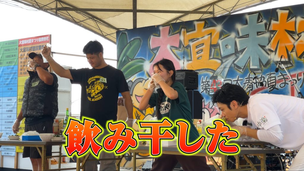 予選を勝ち抜いた参加者たちは、シークワーサーをテーマにした「シークワーサー早絞り・早飲み対決」で決勝戦に挑みます。沖縄を代表する特産品「シークワーサー」を、いかに早く絞り、飲み干すかを競うこの大会では、参加者たちの真剣な表情と、早飲みを応援する観客の熱気で会場は最高潮に!