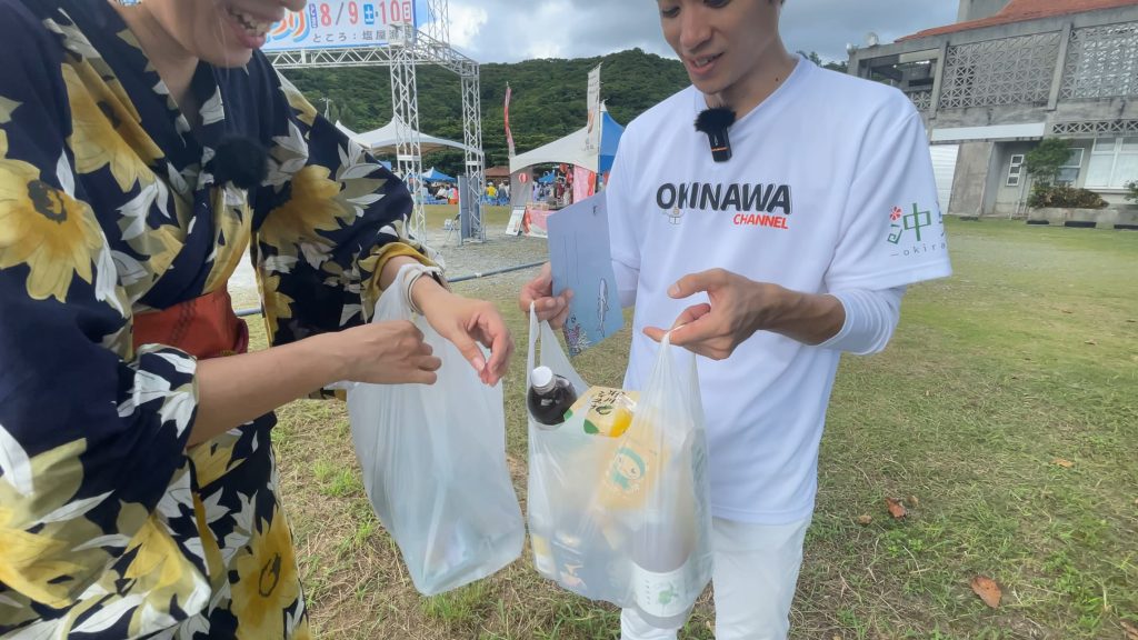 見事優勝したのは、金城さんでした。金城さんには、マンゴーやオリオンビール、まるた(泡盛)、美ら海水族館の無料券、シロップ、ヤンバルスギ(魚)、キャリーバッグなど、豪華な商品が贈呈されました。