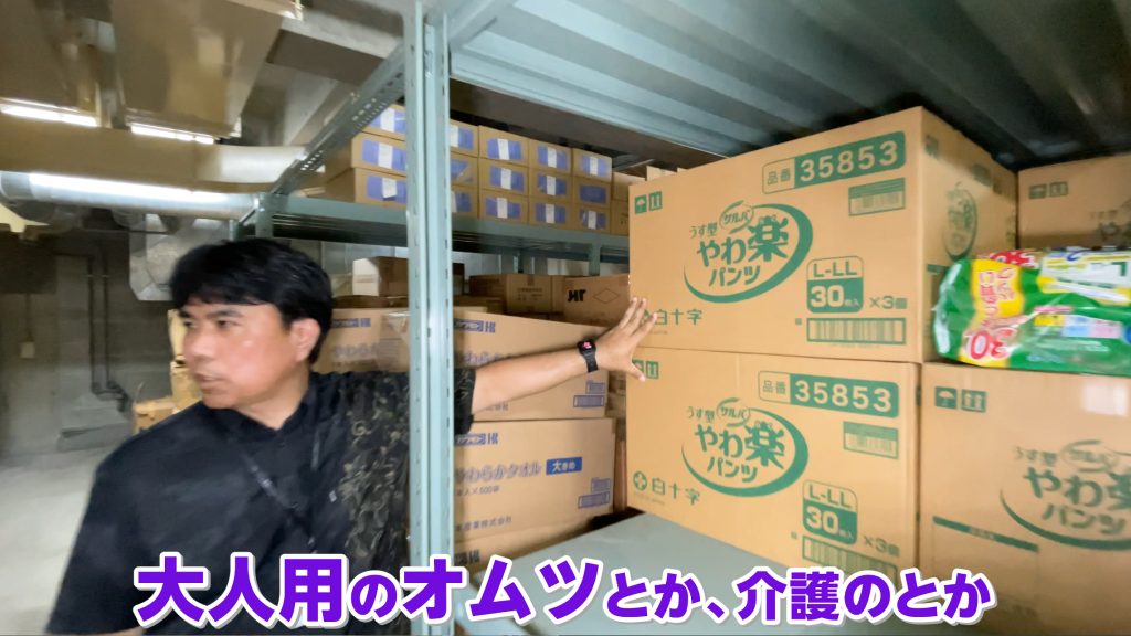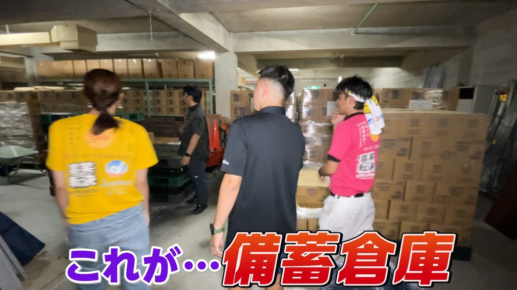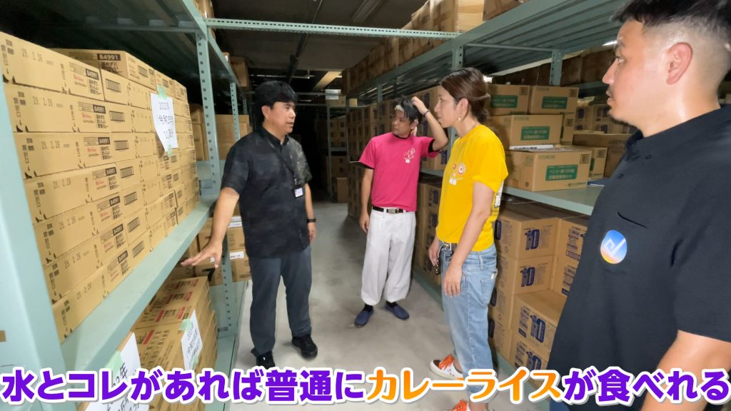 倉庫には、5年や10年保存可能な水が備蓄されており、1人あたり1日3リットル、3日分で9リットルの水が必要とされています。