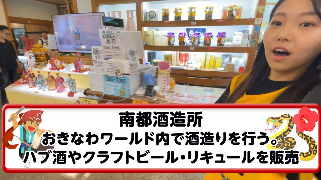 園内には、沖縄の自然の恵みを活かした酒造りを行っている『南都酒造所』もあります。ハブ酒はもちろんのこと、クラフトビールやリキュールなど、様々なお酒の製造工程を見学でき、お土産にぴったりな珍しいお酒を見つけるのも楽しみの一つです。