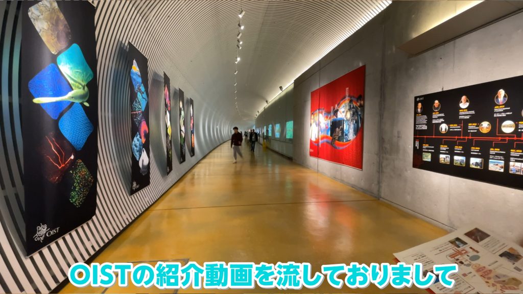 メインエントランスを抜けると現れるのが、円筒形の美しい「トンネルギャラリー」です。OISTが丘の上に位置するため、山の下から建物へと続くユニークな構造です。トンネルという名前の通り、奥へと続く通路には、OISTの紹介映像が流れ、研究活動の様子や歴史がパネルで展示されています。普段は入ることができない研究室の内部写真なども見ることができ、OISTの「今」を垣間見ることができます。まるで未来の科学の世界への扉が開かれているかのようです。