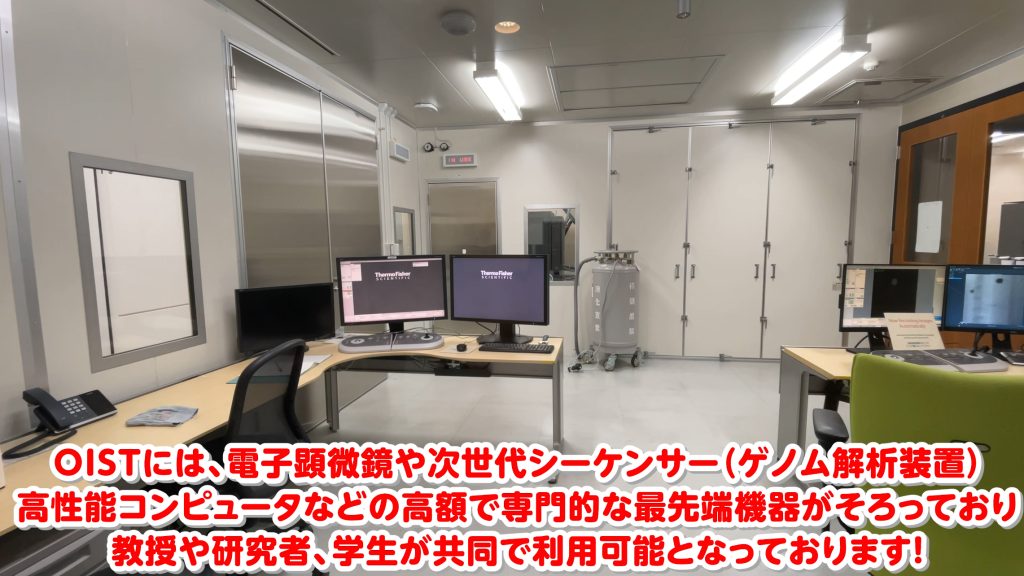 研究棟内には、電子顕微鏡室や次世代シーケンサー(ゲノム解析装置)、高性能コンピューターなど、高額で専門的な最先端機器が揃っており、これらは教授や研究者だけでなく、学生も共同で利用可能です。これらの機器を扱うには高度な専門知識が必要ですが、OISTにはそれぞれの機器に精通した専門スタッフが常駐しており、操作方法やデータ解析など、手厚いサポートを受けることができます。これにより、研究者は機器の扱いに時間を取られることなく、本来の研究活動に集中できるのです。