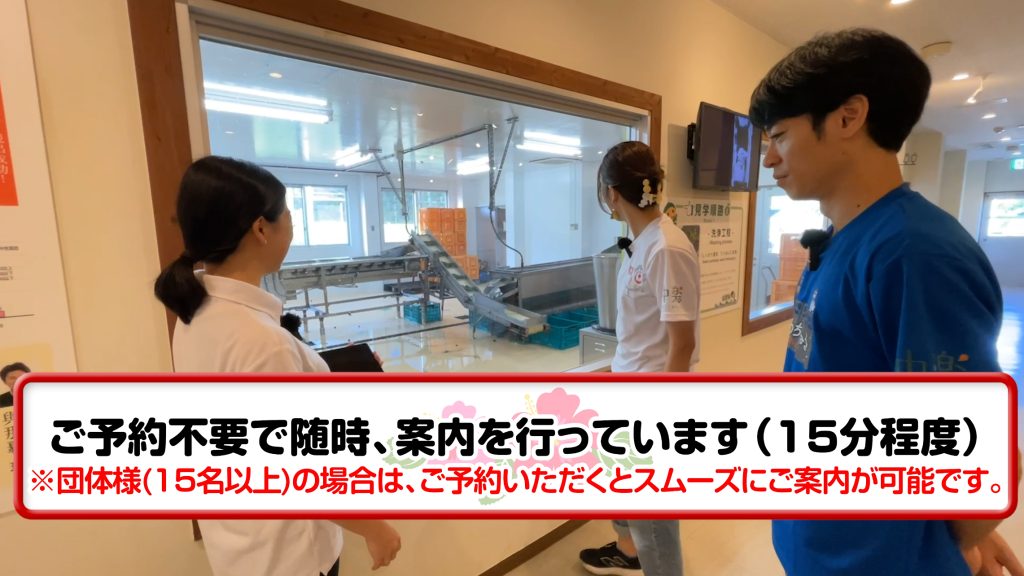 - 工場見学: 予約不要で随時案内(15分程度)。団体様(15名以上)は予約するとスムーズです。