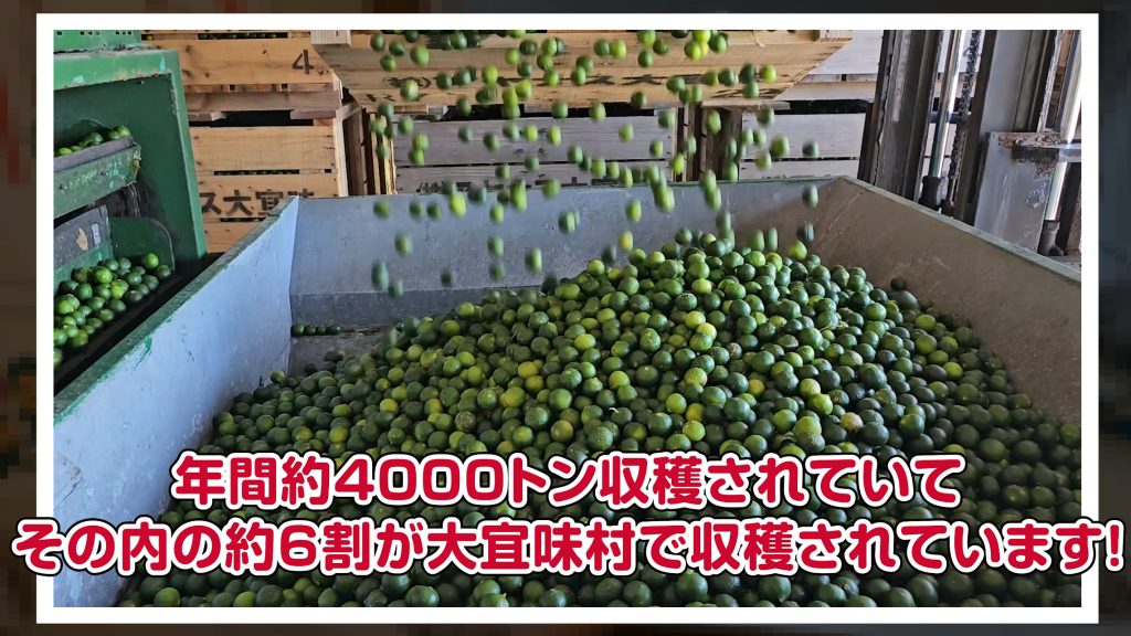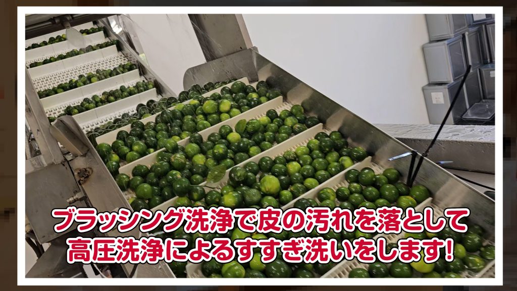 動画では、巨大な木箱に山盛りの「緑の宝石」とも呼ばれるシークワーサーが、勢いよくコンベアへと流れていく迫力満点の映像が公開されました。なんと、この木箱一つで約400キロものシークワーサーが収められているそうです。工場内ではブラッシング洗浄と高圧洗浄によって皮の汚れが丁寧に落とされ、ピカピカになったシークワーサーが搾汁室へと運ばれていきます。