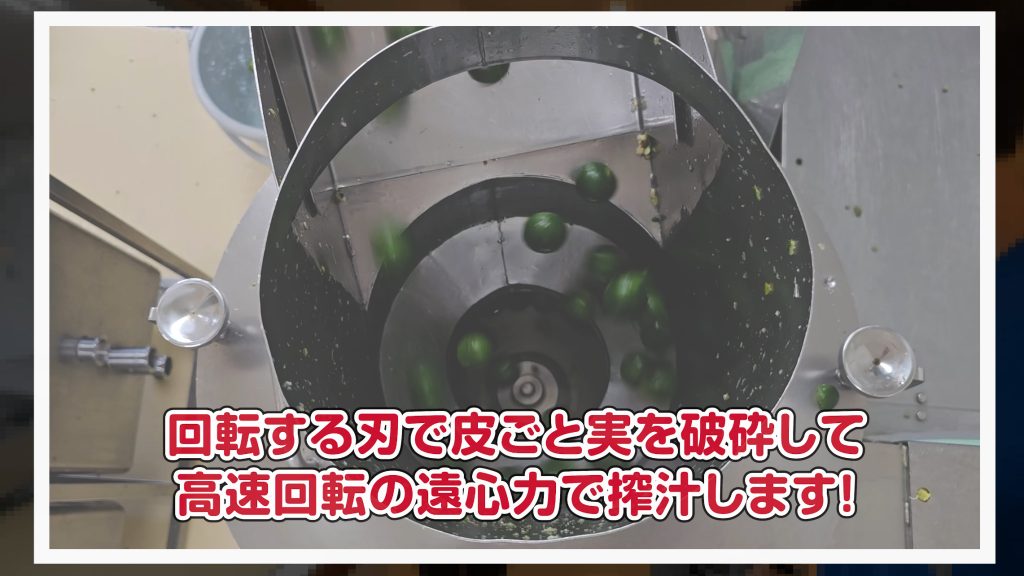 そして、皮ごと実を破砕し、高速回転の遠心力で果汁を絞り出す驚きの工程が明かされます。この皮ごと絞る製法こそが、シークワーサーが持つポリフェノールの一種「ノビレチン」を最大限に引き出す秘密なのです。