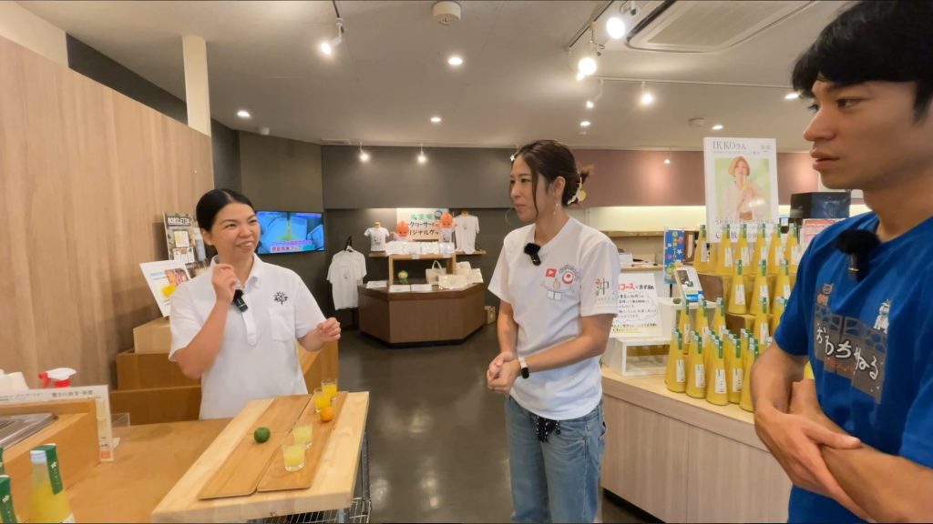 9月に採れる青切りシークワーサーと、12月に完熟したシークワーサーのジュースを飲み比べたひーとーさんとちよめのすけさん。青切りシークワーサーのパンチのある苦味と酸味には驚きを隠せず、完熟シークワーサーのフルーティーな甘酸っぱさには感動していました。