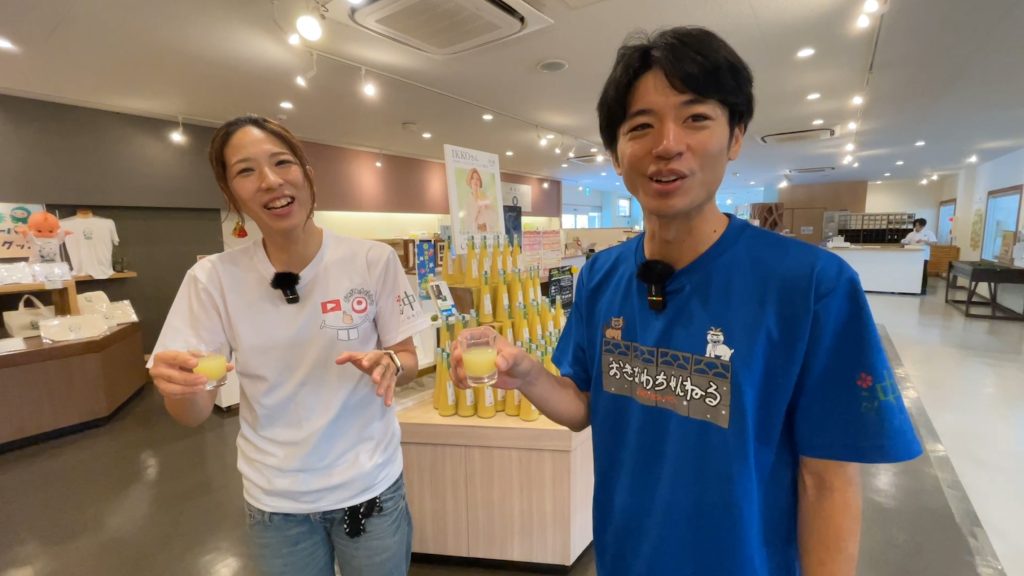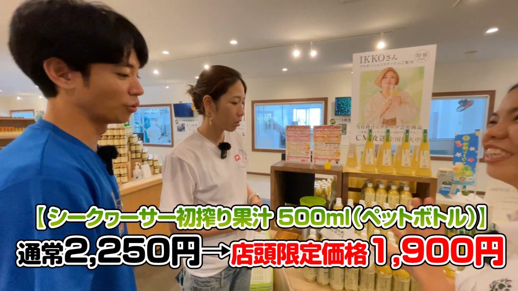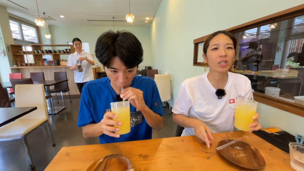 ひーとーさんとちよめのすけさんが試飲する様子は、まるで子供のように目を輝かせ、その新鮮さに驚きの声を上げていました。通常のシークワーサージュースとは一線を画す、苦みと酸味、そしてほのかな甘みが織りなす「果汁」の深い味わいは、まさにここでしか体験できない贅沢です。