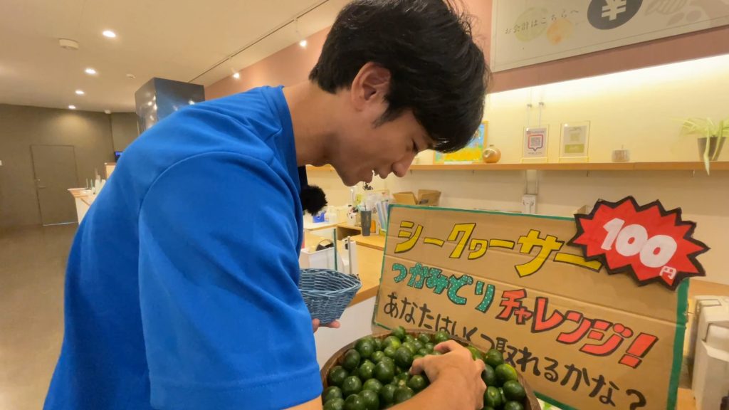 レジの横では、1回100円でシークワーサーの掴み取りチャレンジに挑戦できます。収穫時期である9月〜12月のみ開催しており、男性では13個取れた人もいるとか!あなたの記録に挑戦してみてください。