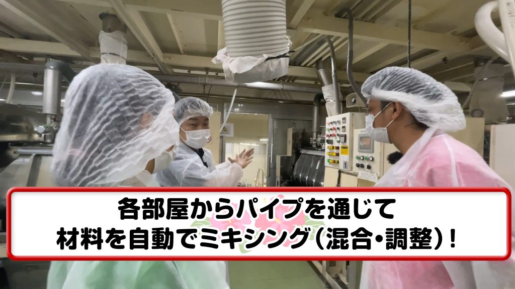 特筆すべきは、各部屋からパイプを通じて自動で材料がミキシングされるシステム。人間の手を極力介さず、均一な品質を保つための最新技術が導入されていることに感銘を受けました。