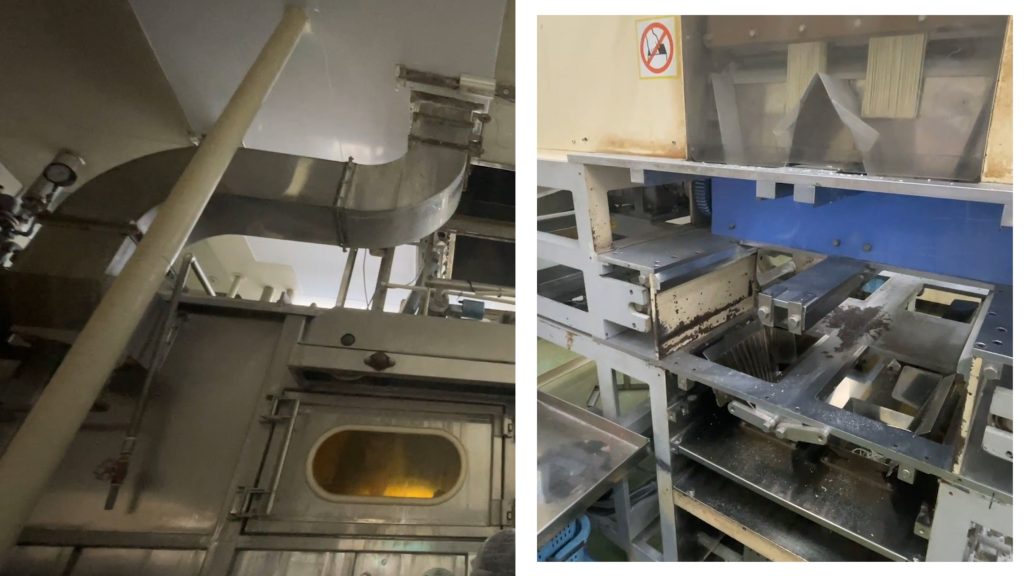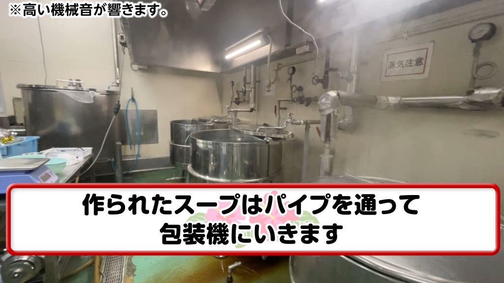 そして、サン食品さんの強みは、麺だけでなくスープの製造も自社で行っていること。豚骨味と鰹味の2種類の出汁は、それぞれ専用のタンクで丁寧に作られ、パイプを通じて包装機へと運ばれます。