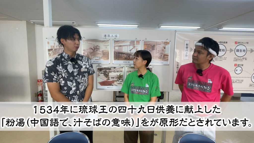 工場見学の後は、サン食品の松吉さんから、沖縄そばの奥深い歴史について学びました。