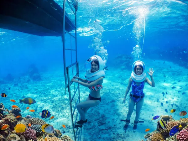 まずハシゴにつかまり肩までつかります。スタッフがヘルメットをかぶせてくれるのでゆっくり一段ずつ降りていきます。海中をゆっくり歩いて海中散歩をご案内します。周りを見渡せばたくさんの熱帯魚を見ることができます。