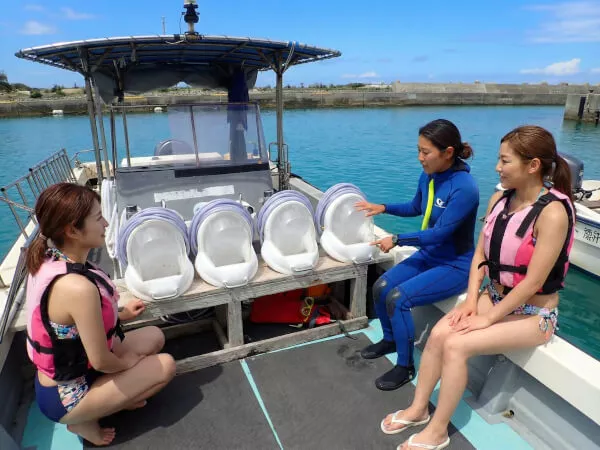 シュノーケリング終了後、少し休憩しその後シーウォークの説明を行います。専用のボートでポイントまで向かいます。港から5分ほどになります。