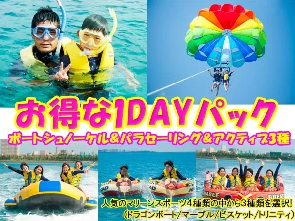 沖縄本島中部『アラハビーチ』パラセ―リング&マリンスポーツ3種目セット【北谷町・約1時間半・6歳以上・2名~・当日電話申込可】