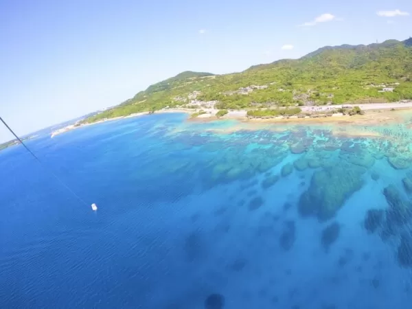 カラフルなセールを背に、上空から眺める空と海のコントラスト、爽やかな海風を肌で感じ、沖縄北部の美しい島々の景色を是非ご堪能ください!