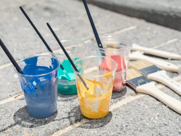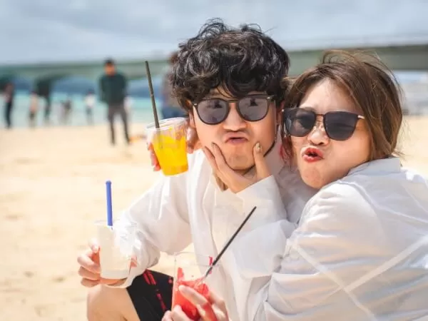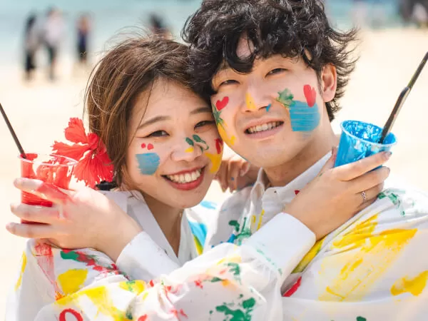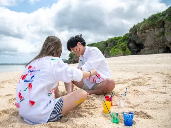 子供から大人まで楽しめシャツや体に落書きしながら沖縄の海を背景に