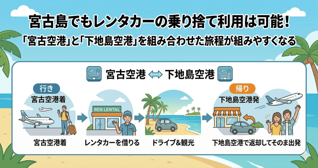 宮古島でのレンタカー乗り捨てサービスは、宮古空港とみやこ下地島空港を併用する旅行者にとって非常に便利なシステムです。