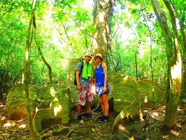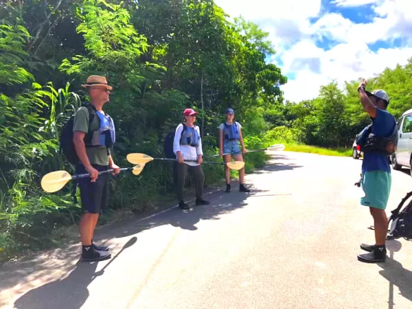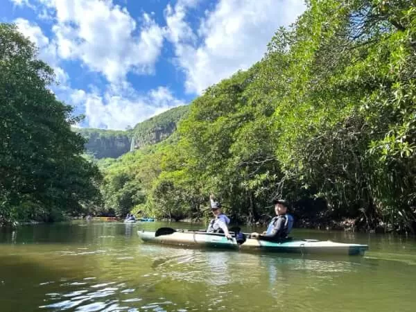 滝を目指しての道中もお楽しみの一つ。生い茂るマングローブ林に囲われた広大な川をカヌーでクルージングしたり、亜熱帯の動植物が生きる森の中を進みます。
