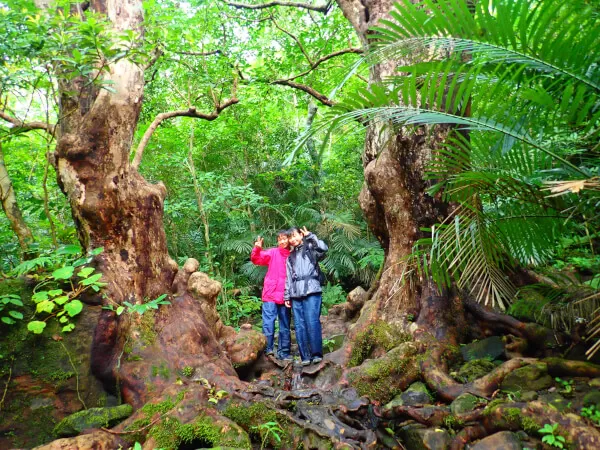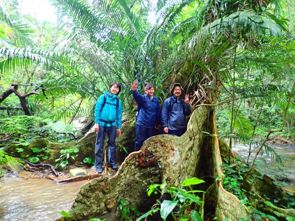 カヌーを降りたら、ピナイサーラの滝上を目指してジャングル登山の開始です。 サキシマスオウノキや亜熱帯の生き物たちとの記念撮影も忘れずに。 海が見えるポイントまで来たら滝上まであと少しです。 |