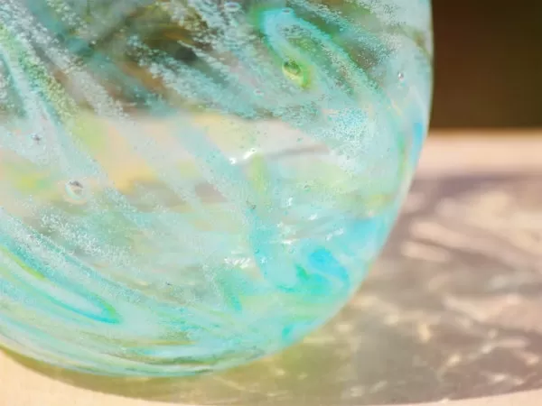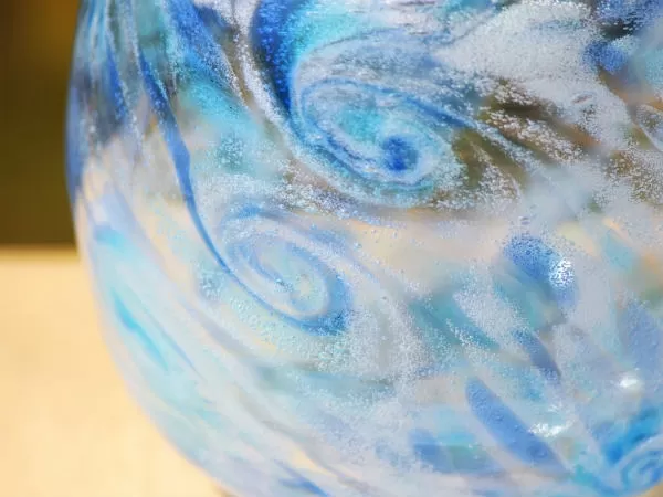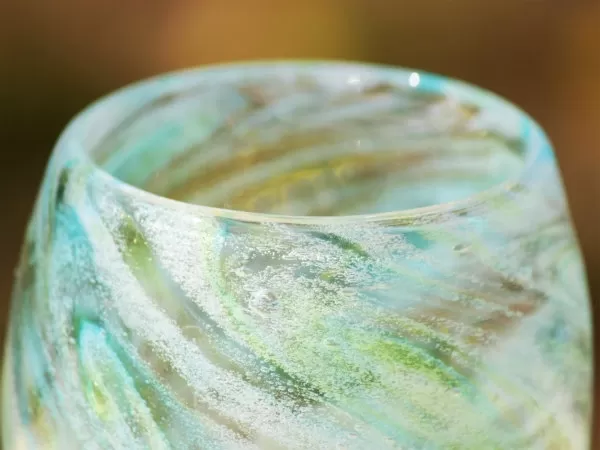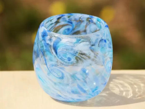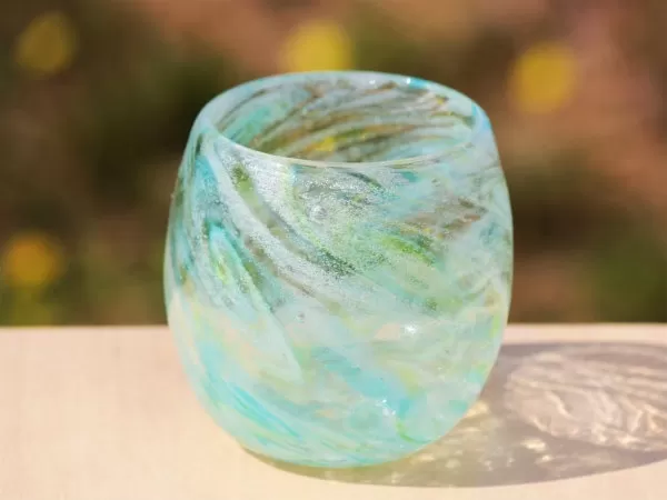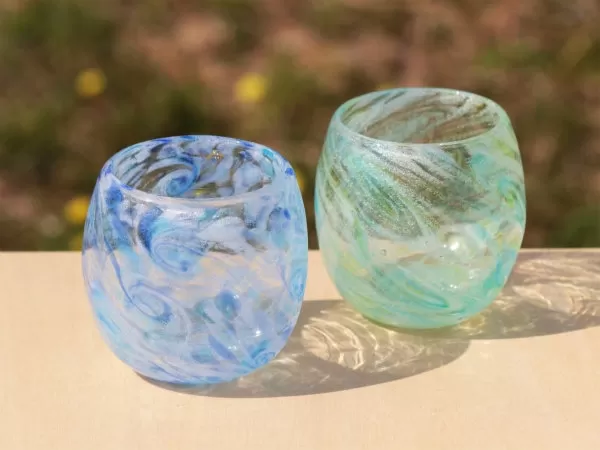 恩納村近く「琉球ガラス体験・たるグラス作り(柄:せせらぎ青緑系2色)」★石川IC約3分【約10~15分・6歳以上・1名可・当日電話申込可】