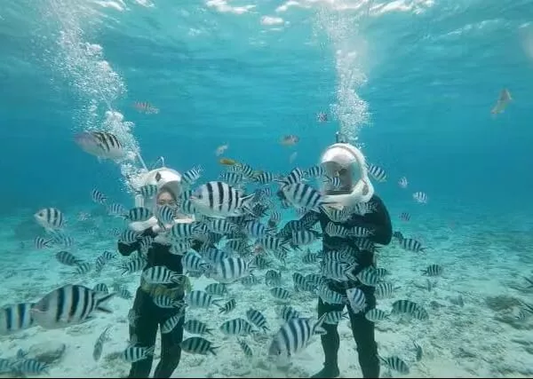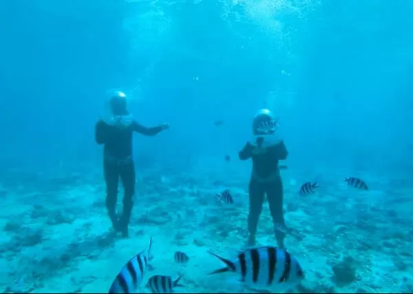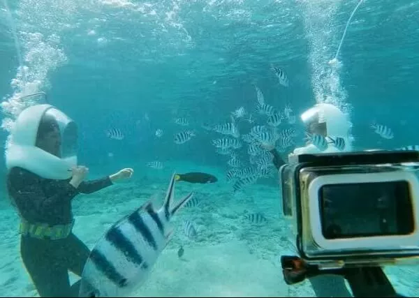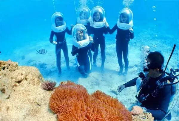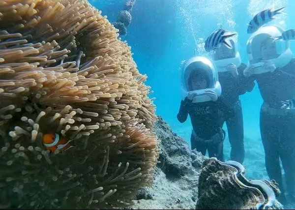 気分は人魚?!海中の世界を堪能できます マリンウォークとマリンスポーツ2種類がセットになった、オールシーズン楽しめるプランです。 マリンウォークでは地上のように自然に呼吸ができるので、ダイビングは怖いけど海底世界を見てみたい、という方にぴったり。 カラフルな熱帯魚とお友達になっちゃいましょう! 海を知り尽くしたガイドがお客様のペースに合わせ、丁寧にレクチャーします。