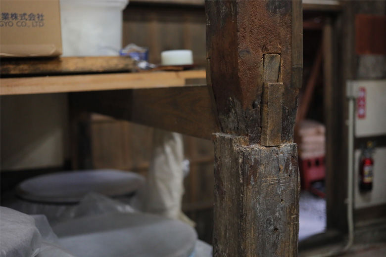 戦前と同じ場所で泡盛を仕込む津嘉山酒造所の柱には防腐処理がされていません。