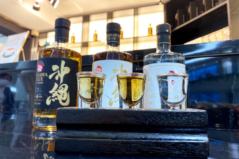 ライスウイスキー「沖縄BLUE 8年」、ホワイトオークの新樽で約3年寝かせた「沖縄BLUE 43度」、樽貯蔵前のフレッシュな「NEWMAKE(ニューメイク)」が少量ずついただけるセットです。