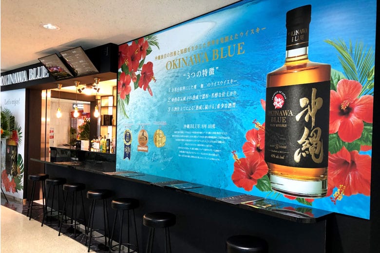 「沖縄BLUE 」は久米仙酒造のオンラインショップや県内のリカーショップなどで購入できますが、おすすめは今年6月に那覇空港内にできたばかりの久米仙酒造ウイスキーBAR「OKINAWA BLUE(オキナワブルー)那覇空港店」。
