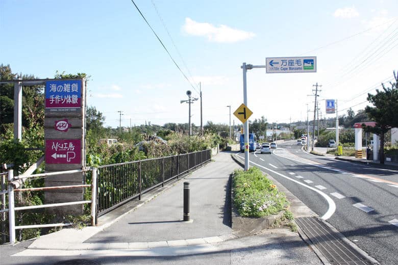 人気観光スポット「万座毛」の道案内看板のすぐ手前に位置し、恩納村「恩納郵便局」の斜めにあるので、アクセスがすごくわかりやすいです。
