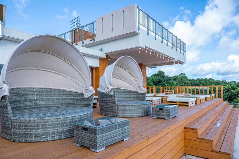 テラスにはウッドデッキが敷かれ、ゆったりとしたソファーや屋根付きのシートがずらり。