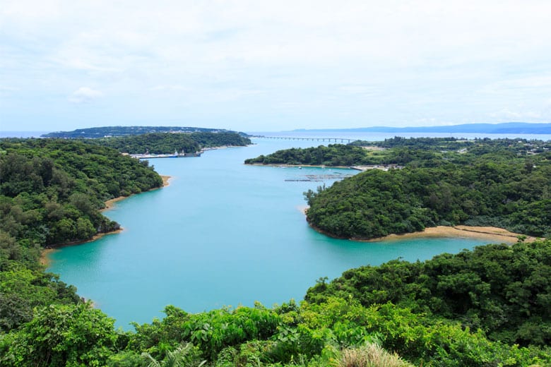 ご覧ください!眼下には「ワルミ海峡」が広がり、その先には大人気観光スポット、古宇利島と古宇利大橋まで大パノラマで見渡せるのです。