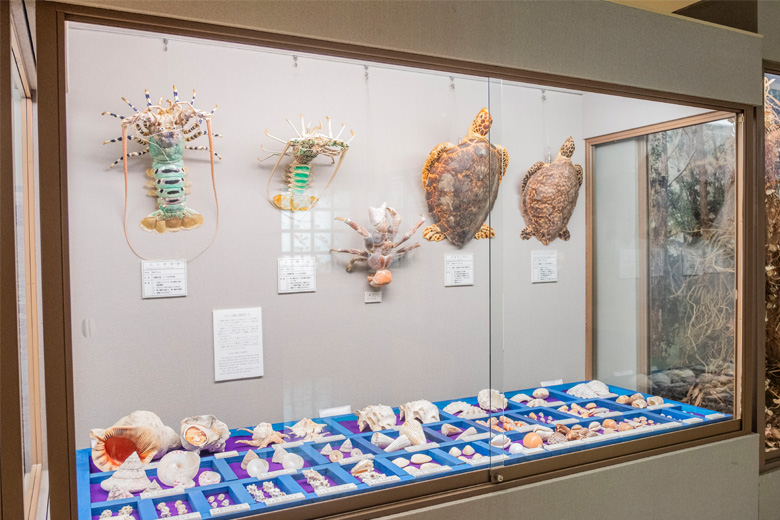 沖縄県の絶滅危惧?類に指定されている貴重なヤシガニをはじめ、エビ、ウミガメ、特徴的な貝などが、数多く展示されています。