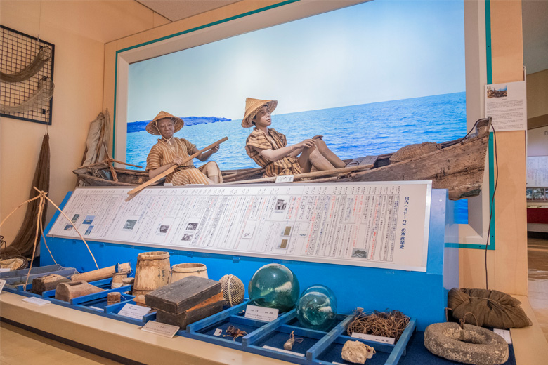 カツオ漁で栄えた宮古(ミャーク)の水産業史が記されており、サバニと呼ばれる小型のクリ舟にのり、漁に向かう漁師の様子を今に伝えています。
