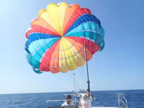 パラセールは専用のボートでご案内致します。少しずつ高度を 上げていきます。通常フライト50mほどです オプションで200mに延ばすことができます!(1名様3500円別途)