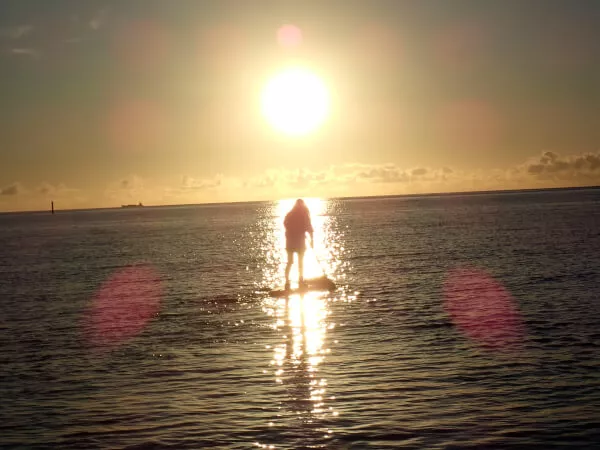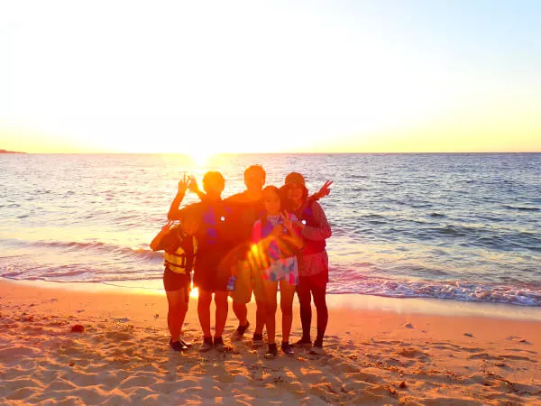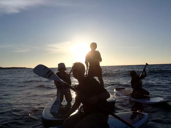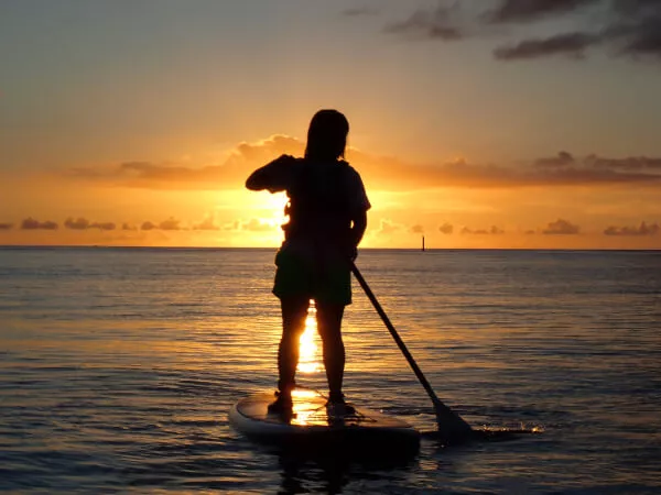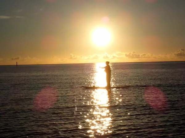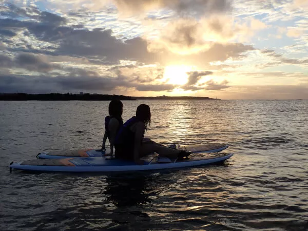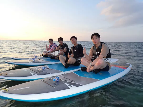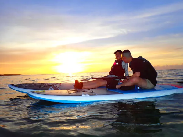 夕陽が美しく輝く沖縄の海で、穏やかな時間を楽しみながらサップをおこないます。