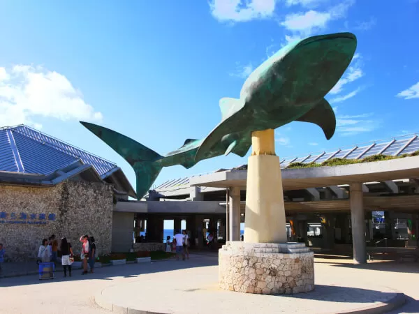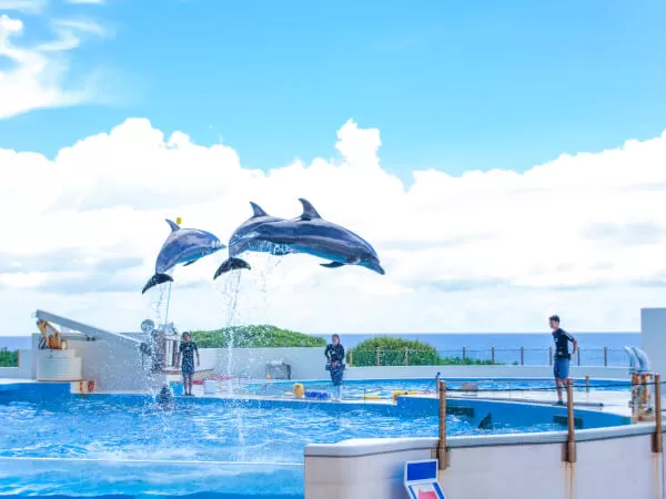 世界最大級の水槽「黒潮の海」に悠々とジンベエザメが泳ぐ様子は必見!水族館の外にある「オキちゃん劇場」では、青い海をバックにイルカショーを楽しめます。