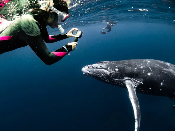 ホエールスイムは、スノーケルセットを装着し、クジラ達を驚かさないように水面から観察するツアーです。